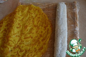 Хочу сегодня Вас угостить очень нежным роллом с омлетным блинчиком. Меня этот рецепт выручает в тот момент, когда я делаю роллы из остатков и они начинают у меня на глазах рассыпаться, расплываться.. Тогда я просто заворачиваю "некондицию" в омлет, разрезаю на части и подаю на стол, как будто так и задумано. Судя по тому обилию ассортимента таких роллов в кафе и ресторанах, данная формовка спасает не одну меня :-)