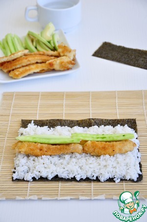 От листа нори отрезать 4 см (4шт). Выложить его на бамбуковый коврик. Смачивая руки в воде, выложить слой риса оставив 2 см нори. Если есть японский майонез, смазать им рис, на рис выложить куриное филе и огурец.