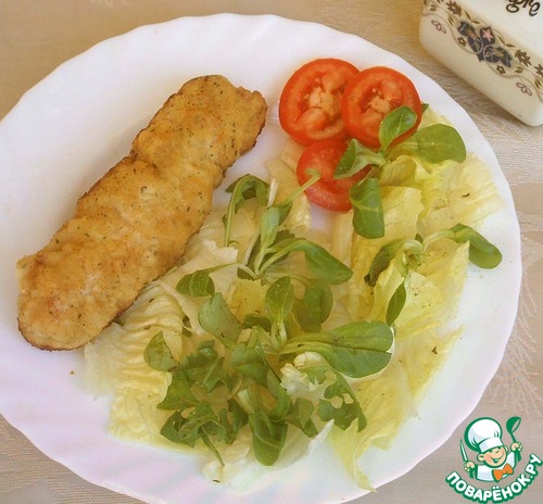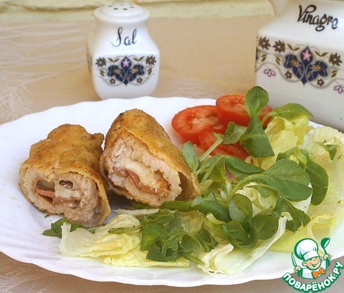 По прошествии времени достаем мясо, сверху кладем небольшой кусочек хамона (пармской ветчины, сыровяленой ветчины) и (опционально) сыра. Сворачиваем рулетиком, обваливаем в муке, затем в яйце, затем в сухарях.