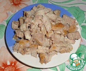 Мясо берем либо отварное режем на маленькие кусочки, либо тушим сырое мясо на сковороде до готовности.