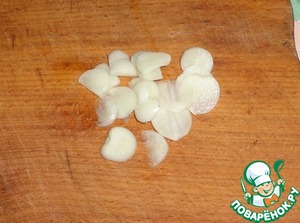 Сверху кладем мясо, поверх мяса - чеснок (распределить равномерно).