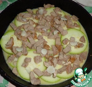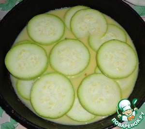 Кабачок порезать на кружочки. Вылить в форму для запекания 1/3 заливки. Выкладываем кружочки кабачка (половину).