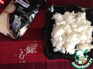 Готовим рис: промываем холодной водой, пока она не станет прозрачной. Заливаем рис водой в соотношении 1:2, доводим до кипения, накрывем крышкой и варим минут 20. Затем, снимаем с огня и оставляем еще на 10-15 минут под крышкой. Далее, чуть-чуть охлаждаем - можно перемешать лопаточкой, но не ставьте рис в холодильник! Заправляем рисовым уксусом.