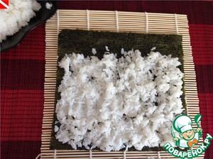 Лист нори раскладываем матовой стороной вверх на бамбуковой циновке (макису). Распределяем приготовленный рис поверх нори, оставляя небольшую полоску.