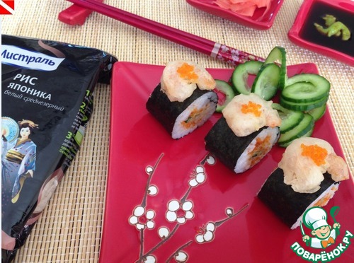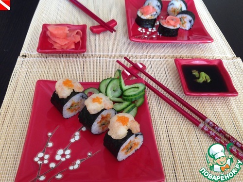 Украшаем креветками-темпура, спиралькой из огурца, маринованным имбирем. подаем с соевым соусом и васаби.