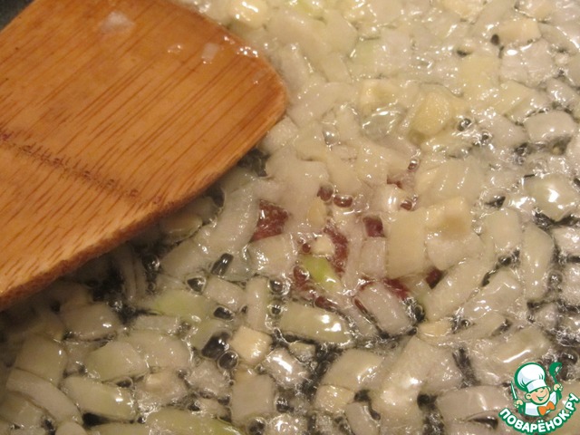 Лук и чеснок чистим и мелко рубим. На сковороде разогреваем немного растительного масла и подрумяниваем в нём лук с чесноком, помешивая, чтобы ничего не пригорело.