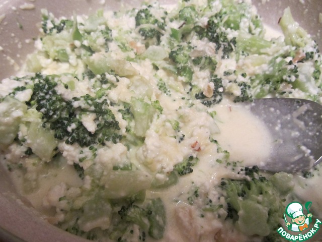 Получившуюся массу аккуратно смешаем с брокколи и луком.