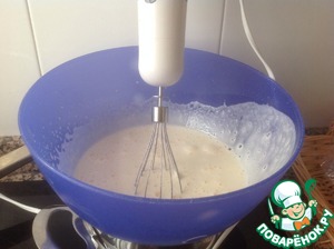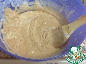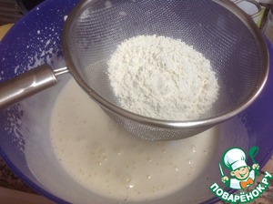 Просеять 1 стакан муки и половину пакетика разрыхлителя. Вымешать воздушное тесто лопаточкой снизу вверх до однородной массы