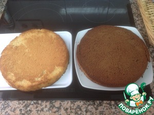 В тесто для черного бисквита добавить половину плитки шоколада, растопленной в микроволновке или на водяной бане. Выпекать в духовом шкафу 20-25 минут при 180 градусах.