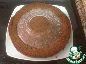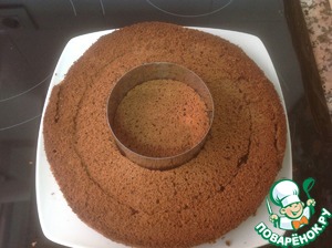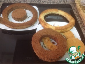 Теперь самое интересное! Остывшие бисквиты будем вырезать кольцами при помощи формы или тарелки и ножа. Сначала большое кольцо