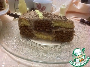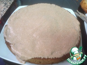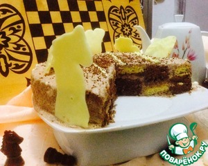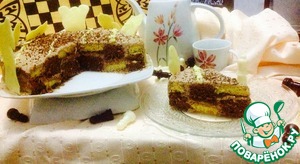 Сверху покрываем слоем крема и украшаем белым и черным шоколадом. Мой сынок нарисовал шахматные фигурки на фольге и вылил белым растопленным шоколадом и вот результат.