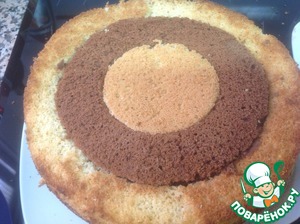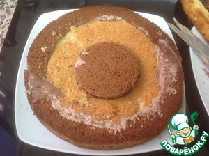 Начнем собирать торт. Сначала большое черное кольцо, затем среднее белое и в середину маленькое черное. Между кольцами я промазываю кремом, чтобы бисквит лучше пропитался. А если без крема, то черно-белые квадратики в шахматном порядке наиболее ярко выражены в разрезе. Оставляют на Ваше усмотрение, какой из вариантов больше понравится.