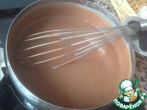 В первую очередь приготовим крем: 1 стакан сахара смешать с 1/2 стакана муки, залить 1л молока. Варить на медленном огне, постоянно помешивая около 10-15 минут. Добавить половину плитки черного шоколада. Растворить полностью. Крем должен быть густой, как сметана. Снять с огня, поставить остужаться.
