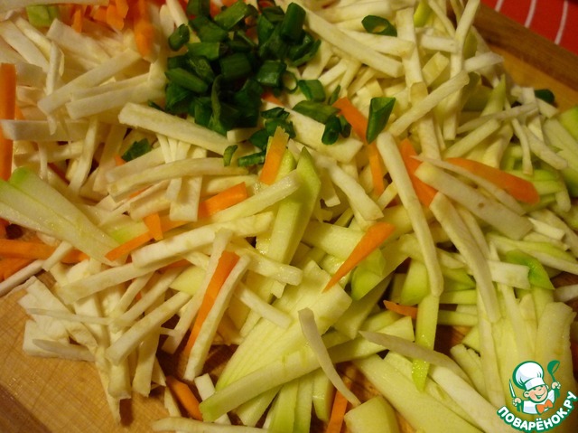Пока варится рис мы шинкуем очень тонкой соломкой морковь, сельдерей, корень петрушки, кольраби. Зеленый лук нарезаем кольцами (поверьте, вы уже потратили калорий больше, чем съедите!!!).