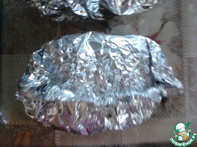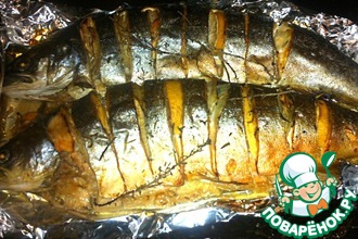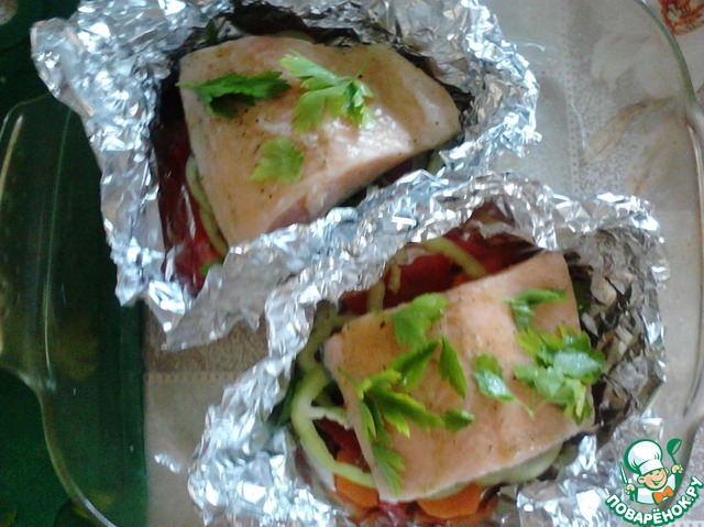 • Защипать края фольги. Запекать при температуре 180 - 200 градусов 30-40 минут. За 10 минут до готовности раскрыть фольгу, для того чтобы рыба зарумянилась.