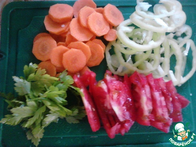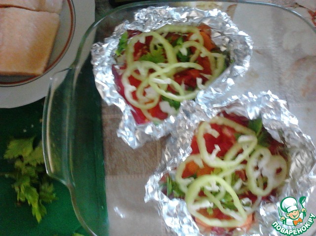 • Приготовить мешочки из фольги. Положить морковь, затем помидоры, петрушку и перец.
