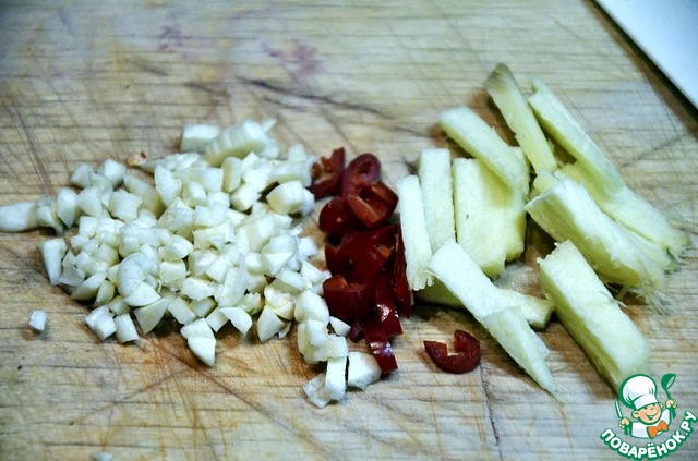 Имбирь, чеснок и жгучий перец мелко рубим.