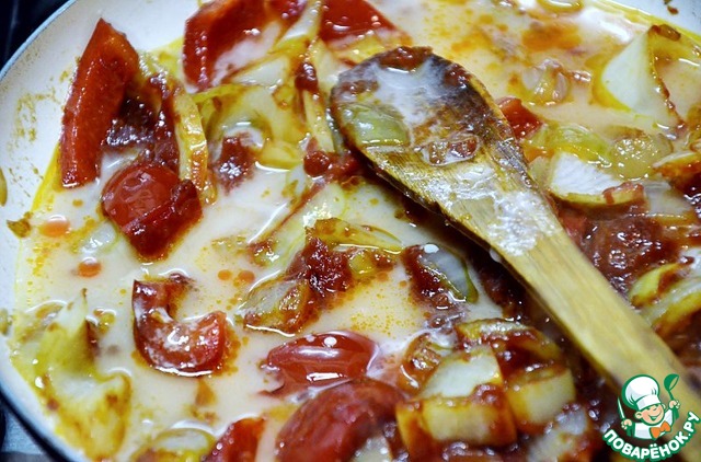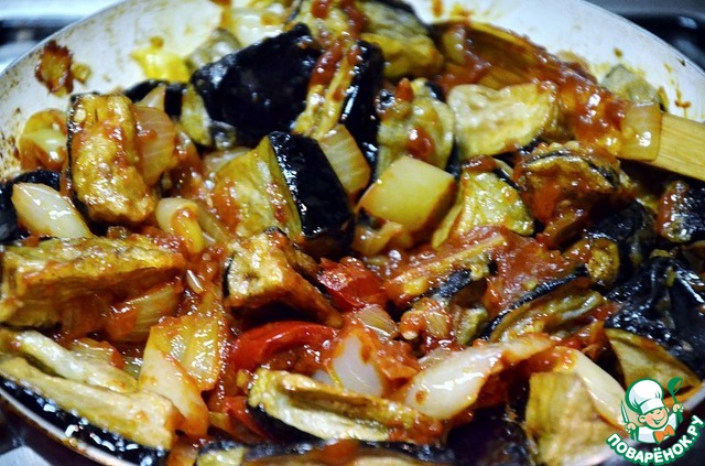 Обжаренные баклажаны выкладываем в соус к овощам, размешиваем и прогреваем.