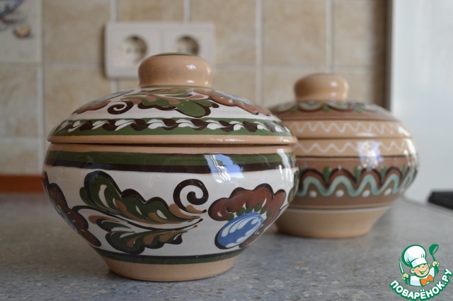 Посуда для готовки. Каждый по литру в нижней части. Можно в один горшок побольше. Если нет глиняных горшков, можно использовать любую посуду с крышкой для духовки. Лучше толстостенную. На крайняк просто толстостенную на плиту, а не в духовке, но тогда получится не печеня, а просто тушеное блюдо.