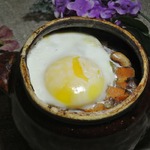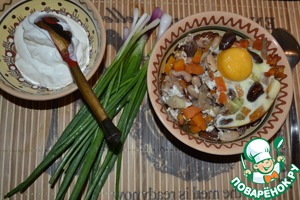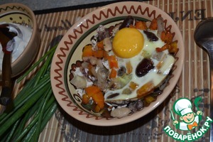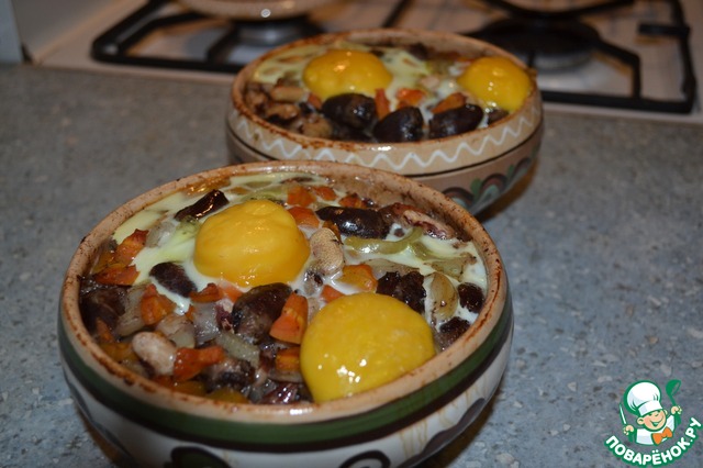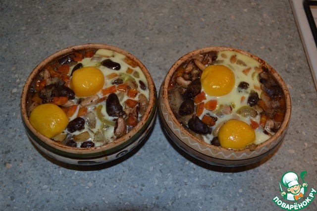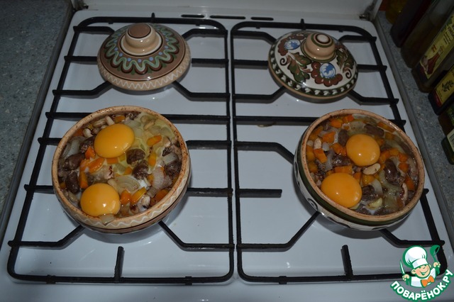 Когда блюдо будет готово, достаем его, сверху вбиваем яйца, чуток их солим. Можно вбить больше. Просто в данном случае 1 горшок рассчитан на двух голодных мужчин) Если сверху блюдо покажется вам суховатым, не страшно, под яйцами оно дойдет до кондиции.