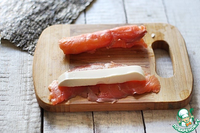 Сёмгу я беру готовую, нарезанную слайсами. Фету нарезать продольными брусочками, не толсто! Завернуть фету в сёмгу.