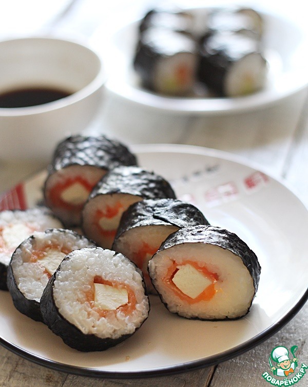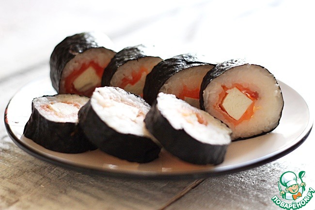 Лист нори выложить на циновку (я обычный бамбуковый коврик обернула плёнкой), на 2/3 руками выложить рис и разровнять, сверху рыбу и свернуть ролл. Перед сворачиванием края нори смочить водой.