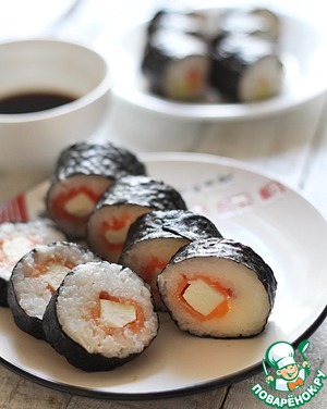 Порционно нарезать (очень острый нож нужно постоянно смачивать в воде) и подавать с соевым соусом или другими приправами. Такая начинка имеет ненавязчивый и одновременно приятный вкус.