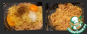 Лук и Картофель натереть на терке. Добавить яйцо, соль, перец. Перемешать.