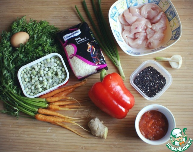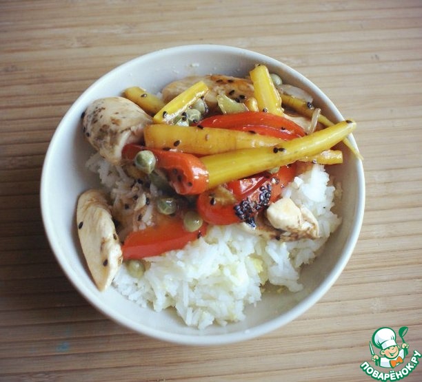 • В пиалу выложить рис, поверх овощи и курицу, украсить зеленым луком.