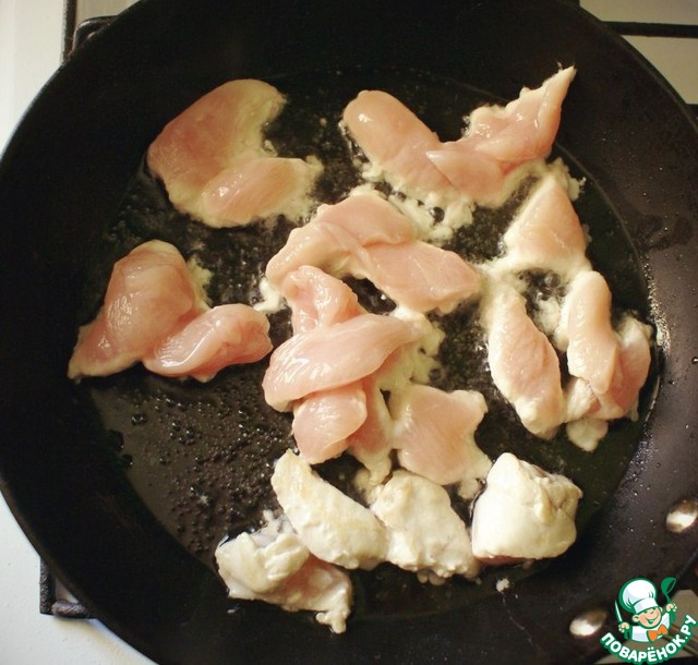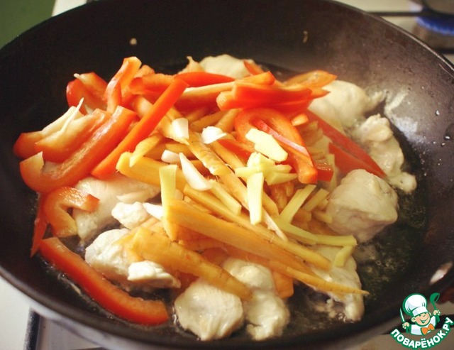 1.после обжарки курицы вытащить ее на тарелку или сдвинуть на широкий край вока.