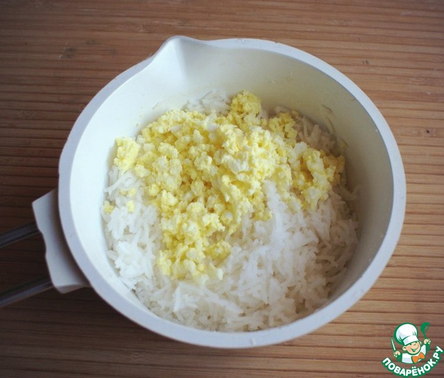 3.яйцо распустить в воке и сделать болтунью, так чтобы обжаривались отдельные яичные хлопья. убрать.