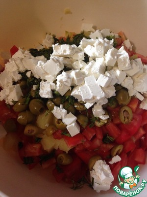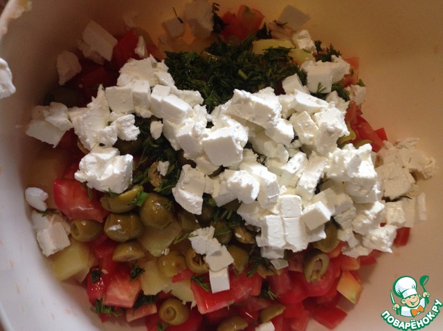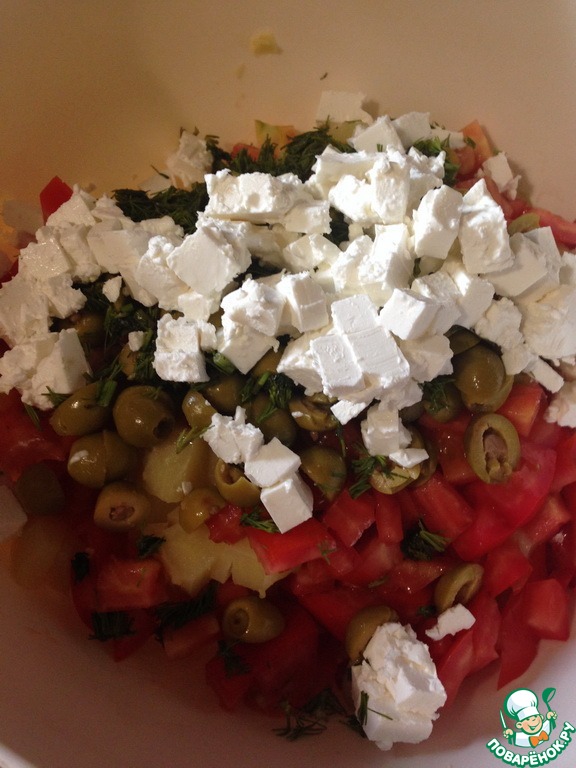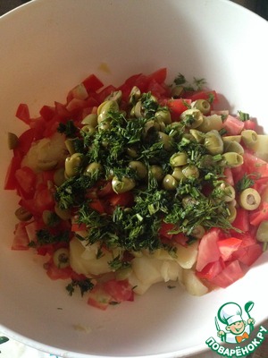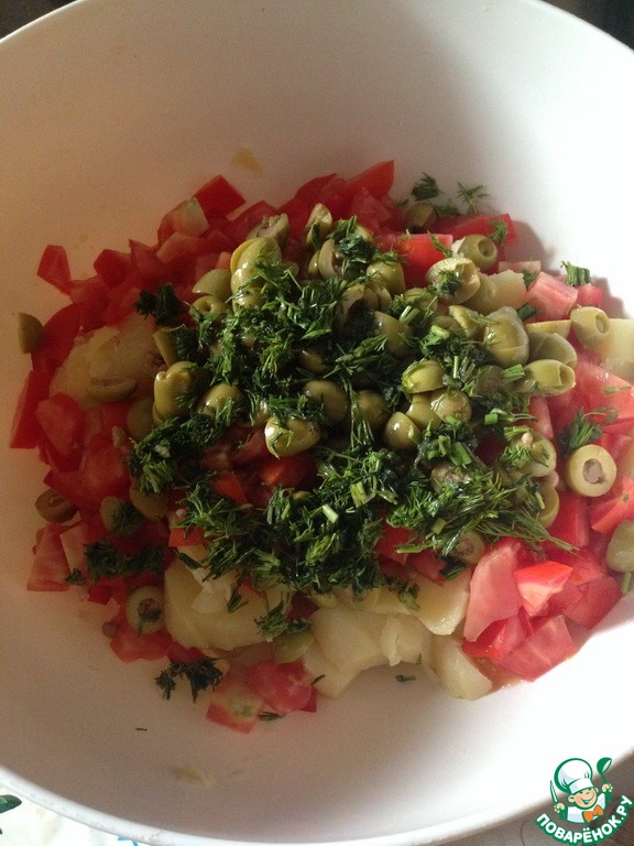 Туда же отправляем крупно порезанные (я просто режу пополам) оливки, укроп.