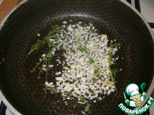 В раскалённом растительном масле обжарить нарезанный чеснок и несколько веточек тимьяна втечении 1-2 минут. Достать веточки тимьяна.