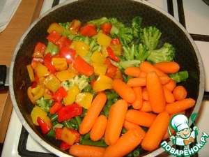 Добавить все овощи и обжарить ещё 2 минуты на сильном огне. По желанию готовое блюдо можно приправить перцем и посыпать тонкими полукольцами сладкого красного лука.