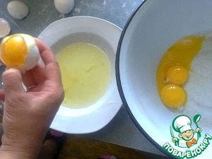Желтки отделить от белков и и положить их в глубокую миску, в которой мы будем делать тесто