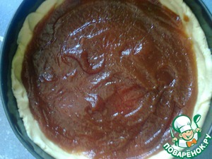 Сверху положить начинку. Если это яблоки и не очень сладкие, то немного можно посыпать их сахаром. Я взяла яблочное повидло.