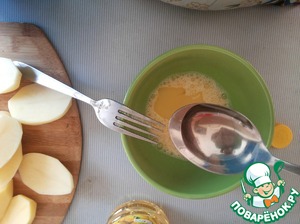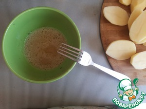 "Купаем" наш картофель в взбитых яйцах. И выкладываем на протвень, в ряды