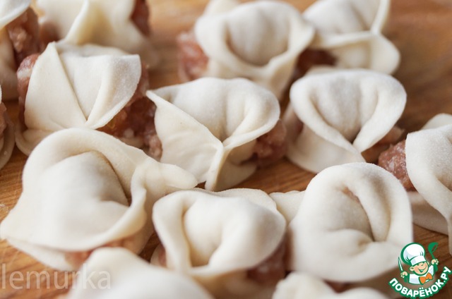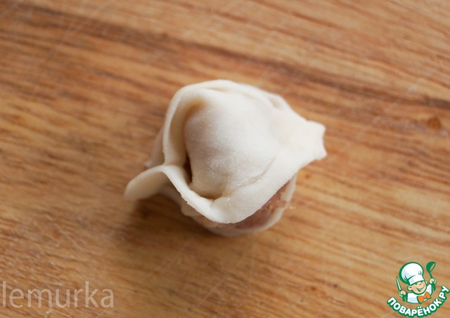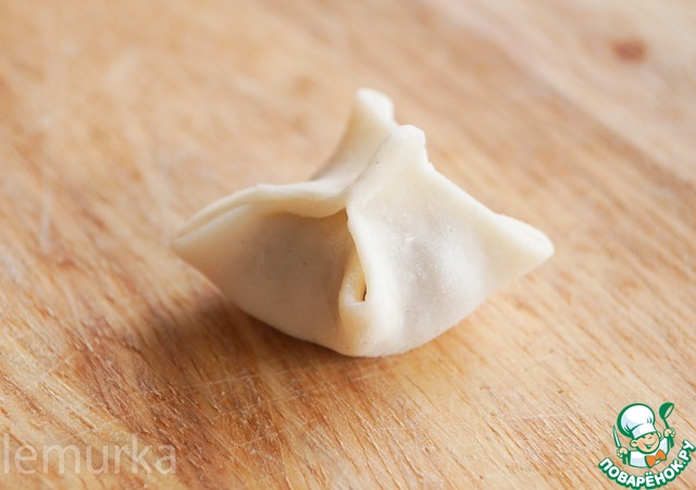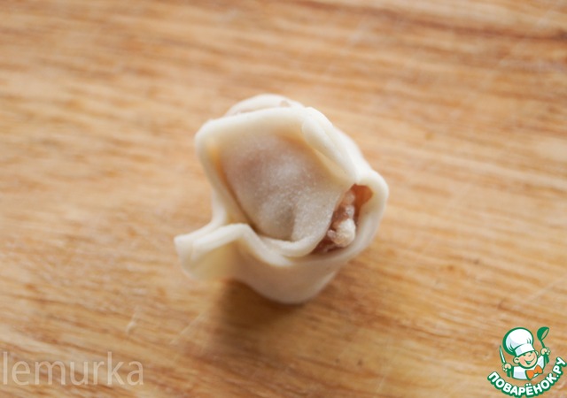 Оставшиеся уголки заводим вниз и защепляем. Всё, наша первая дюшбара готова. Обратите внимание, что бока так и остаются не закрытыми, во-первых, такой способ ускоряет процесс лепки, а во-вторых, при приготовлении мясной сок будет попадать в бульон, делая суп ещё вкуснее.