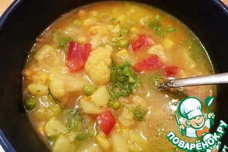 Теперь приступаем к процессу приготовления супа. Для этого нам понадобится ароматный куриный бульон (просто вода не подойдет, будет не так вкусно). Ставим кастрюлю с бульоном на плиту греться, тем временем режем лук, болгарский перец, морковь соломкой и помидоры тонкими ломтиками, и без фанатизма пассеруем их на домашнем топленом масле (если его нет, то обычное растительное подойдет). Для любителей поострее можно добавить стручок острого перца.