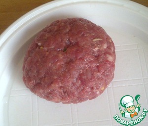 Мокрыми руками отщипнуть от фарша кусочек, как на котлету. Сделать мясную лепёшку (я делала на одноразовой пластиковой тарелке). В центр лепёшки положить начинку.