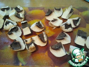 Шампиньены почистить, отделить ножки. Шапочки разрезать на четыре-шесть частей (в зависимости от размера).