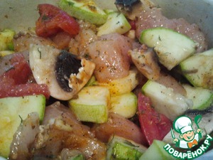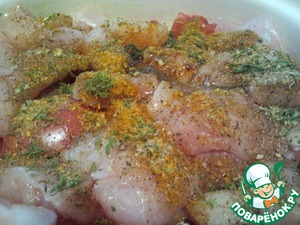 Все вышеперечисленное уложить в емкость. Присыпаем любимой приправой и солью по вкусу.