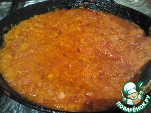 Обжариваем лук до золотистости, добавляем морковь. Пока она обжаривается разбавляем томат пасту водичкой. И вливаем к морковке. Подсаливаем. Тушим до готовности.
