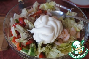 Перемешать. Всыпать креветки (я взяла баночку креветок в рассоле 200 г.).