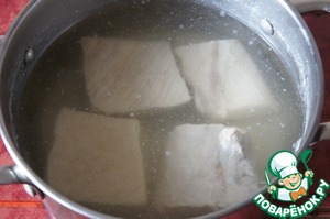Мясо сварить до готовности и оставить остывать в бульоне.
