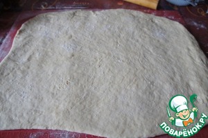 Итак, раскатать тесто в прямоугольник и по всей поверхности равномерно присыпать 1 частью соды.