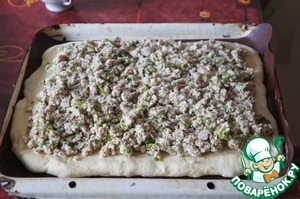 Раскатать 1-ю часть и выложить на противень, смазанный маслом или застеленный силиконовым ковриком. Распределить начинку.