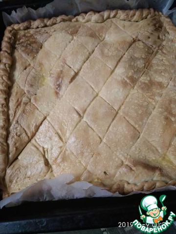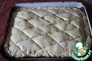 Раскатать 2-ю часть теста и выложить на начинку. Защипать края.