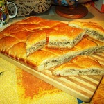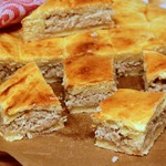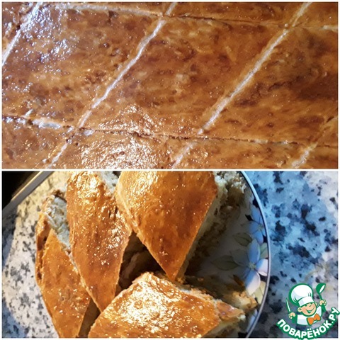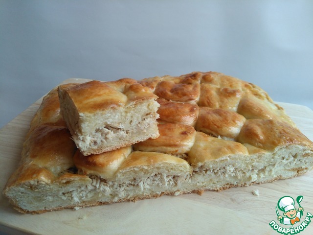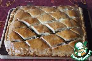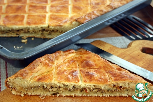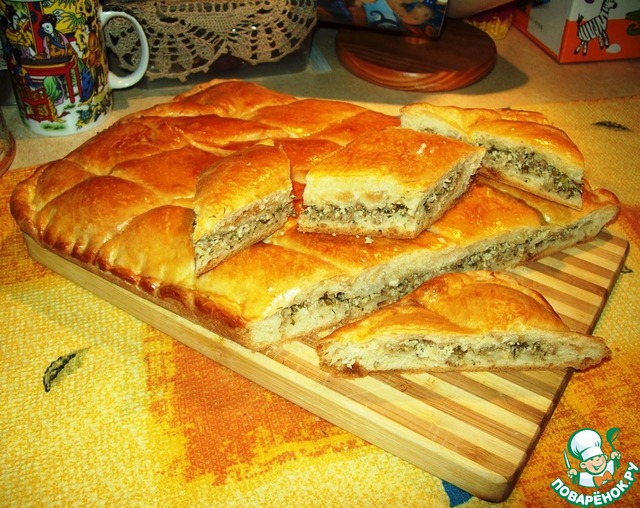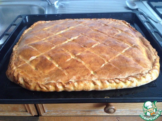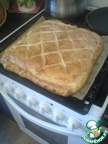 Этот пирог отличается необычной технологией приготовления, в результате чего получается воздушным, мягким и очень вкусным. Начинки, в основном, используются солёные, ну, а самый вкусный получается с мясом. Пирог большой, на противень.