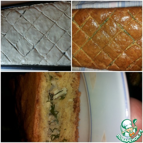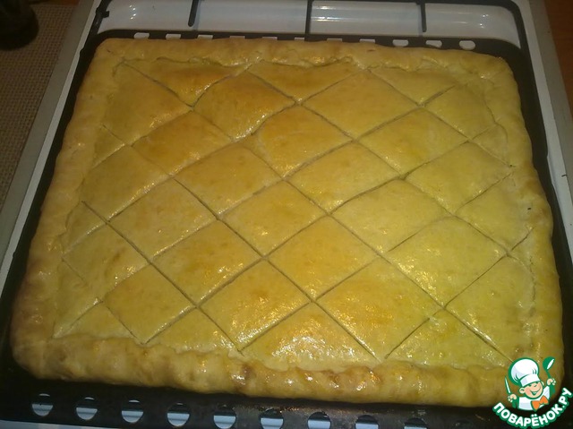 Взболтать желток и смазать пирог, разрезать на ромбы. -